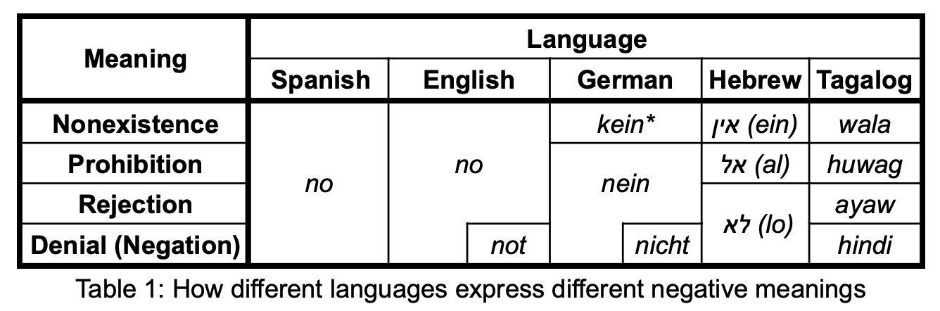 How might this difference in linguistic structure affect how children learn negation? If the concept negation is difficult to learn, then maybe clustered simpler meanings on one word like in English could help children form the necessary abstraction to learn the concept. On the other hand, if the main task is linguistic, then maybe a more 1-1 mapping between meanings and words, like in Tagalog, would be easier to resolve.